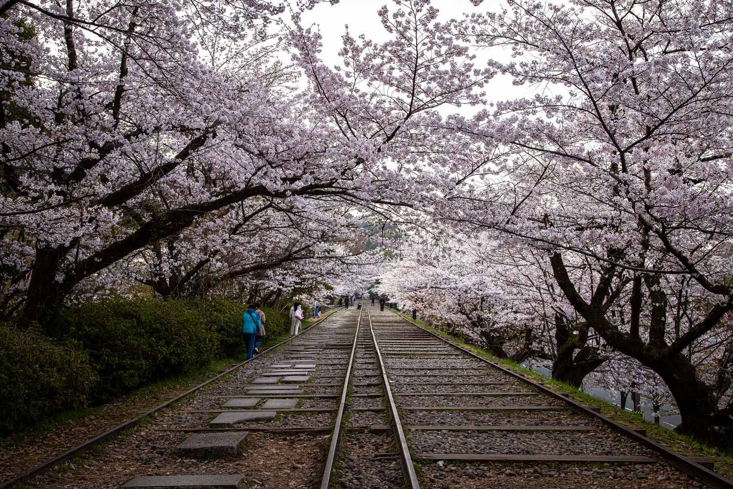 The Keage Incline is a former railway track preserved as a walking path. Cherry trees arch over the tracks on both sides. The perspective — railway lines vanishing into a tunnel of blossoms — is unlike anything else in Kyoto.